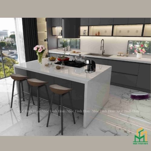 Lớp hoàn thiện Laminate màu xám đồng nhất tạo nên vẻ ngoài tinh tế, sự hài hòa với phong cách kiến trúc đương đại. Bề mặt bếp có khả năng chống ẩm, chống trầy xước hiệu quả và dễ dàng lau chùi, mang lại sự tiện lợi trong quá trình sử dụng hàng ngày.