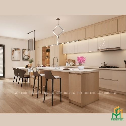 Thiết kế thông minh với đảo bếp đa năng và hệ thống lưu trữ rộng rãi, vừa tối ưu công năng vừa nâng cao tính thẩm mỹ, mang đến trải nghiệm nấu nướng tiện lợi và hiện đại. Sản phẩm được chế tác từ vật liệu cao cấp với lớp phủ melamine và sơn mài bền bỉ, thể hiện sự tỉ mỉ trong từng chi tiết và chất lượng bền lâu.