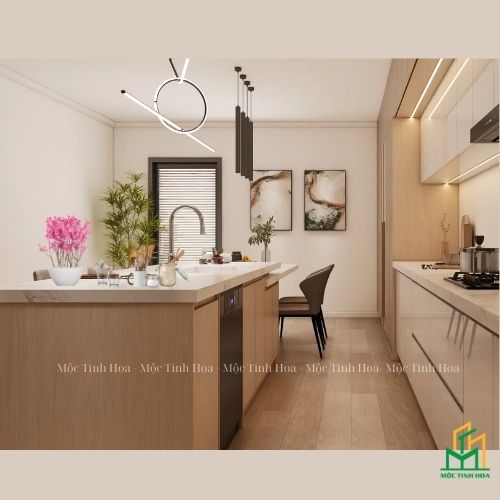 Mẫu tủ bếp nhựa cánh Melamine TBNM04 được Nội Thất 365 thi công thực tế tại nhà khách mang phong cách hiện đại, được kết hợp giữa nét tự nhiên và tinh tế với gam màu gỗ sáng ấm áp cùng tủ trên phủ sơn mài trắng mờ, tạo nên không gian sạch sẽ, tối giản và đầy sức sống.