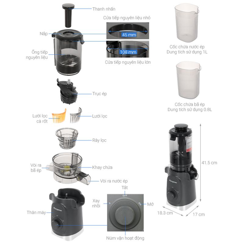 - Bộ cốc đựng tiện lợi: Gồm cốc chứa nước ép dung tích 1 lít và cốc đựng bã riêng, thuận tiện cho việc sử dụng và làm sạch.