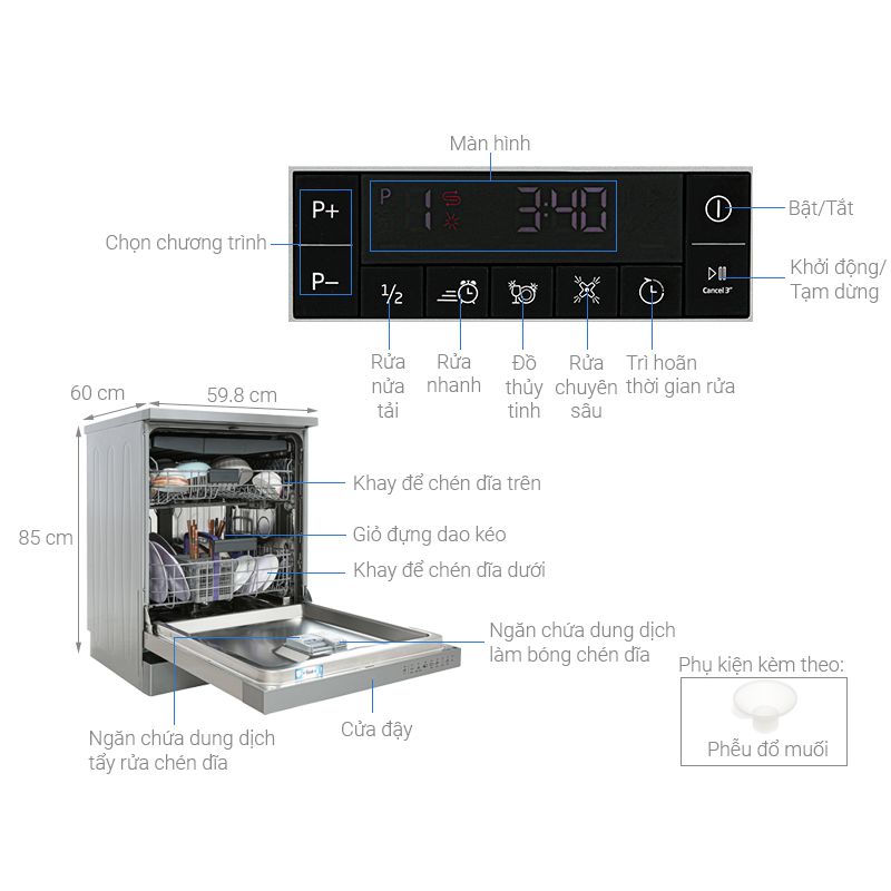 – Chế độ bổ trợ thêm: Rửa nửa tải ½, Tăng tốc độ rửa, Sấy và làm sáng bóng đồ thủy tinh, AquaIntense® Tăng thêm vòi xịt rửa hiệu quả làm sạch, hẹn giờ.